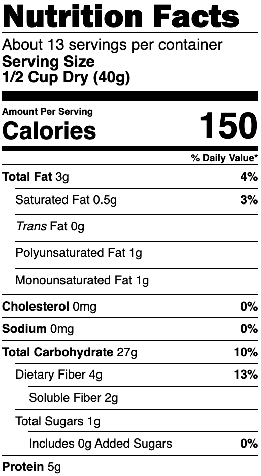 Quaker Old Fashioned Oats - Shop Oatmeal & Hot Cereal at H-E-B Nutrition and ingredients Nutrition Facts about 30 servings per container Serving Size 0.50 cup dry Amount Per Serving Calories 150 % Daily Value * Total Fat 3g 4% Saturated Fat 0.5g 3% Trans Fat 0g Polyunsaturated Fat 1g Monounsaturated Fat 1g Cholesterol 0mg 0% Sodium 0mg 0% Total Carbohydrate 27g 10% Dietary Fiber 4g 13% Total Sugars 1g