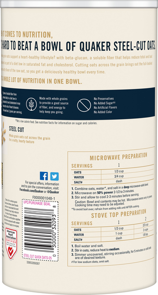 Quaker Quick 1-Minute Oats - Shop Cereal & Breakfast at H-E-B Quick Quaker Oats give you all the wholesome goodness of Quaker in just one minute. Try topping Quick Quaker Oats with fresh or dried fruits, nuts or cinnamon and enjoy the healthy benefits of a satisfying breakfast. Preparing Great Oatmeal: Servings: 1: 1/2 cup oats, 1 cup water or milk, dash salt (Optional) (For low sodium diets, omit salt).