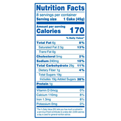 Calories in Hostess Cinnamon Streusel Coffee Cakes and Nutrition Facts Nutrition Facts Serving Size 1 cake (41 g) Amount Per Serving Calories 170 % Daily Values* Total Fat 6.00g 8% Saturated Fat 1.500g 8% Trans Fat 0.000g Cholesterol 15mg 5% Sodium 150mg 7% Total Carbohydrate 28.00g 10% Dietary Fiber 0.0g 0% Sugars 19.00g Includes 19.00g Added Sugars 38% Protein 1.00g Vitamin D - Calcium - Iron 0.60mg 3% Potassium 0mg