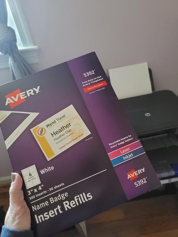 Avery® 05392 - Name Badge Inserts , 3" x 4", White 5392 Quantity $ 29.99 Regular Price $ 29.99 Add to Cart Add to Favourites Who's that walking down the hall? Use Name Badge Inserts to help you identify everyone in your building. Easily design badges using the free Avery ® Design and Print Online software to add names, titles, and logos.