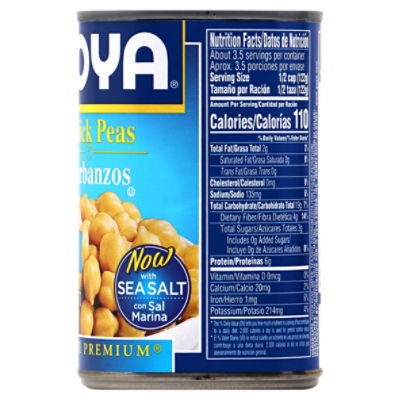 Goya Chick Peas, Low Sodium - instacart.com Nutrition Facts Serving Size 0.50 cup Servings Per Container ABOUT 3.5 Amount Per Serving Calories 110 % Daily Value Total Fat 2g 3% Saturated Fat 0g 0% Trans Fat 0g Cholesterol 0mg 0% Sodium 135mg 6% Total Carbohydrate 19g 6% Dietary Fiber 4g 16% Sugars 3g Protein 6g Percent Daily Values are based on a 2,000 calorie diet. Popular Brands Goya Chick Peas, 16 Oz - Walmart.com Product details. These Goya Chick Peas complement a wide range of cuisine. Also known as garbanzos, they can be enjoyed as a side dish or mixed in with soups, salads and other favorites. The bag contains 16 oz of Goya peas. Goya Chick Peas, 16 oz: Chick Peas. No. 1 grade.