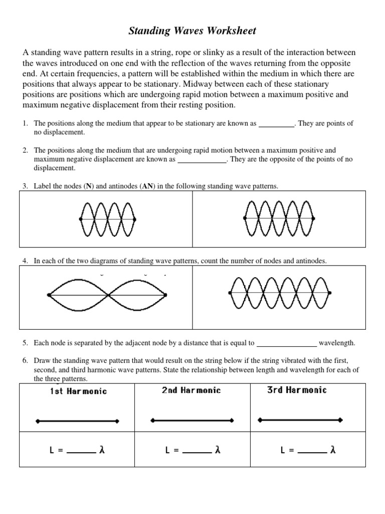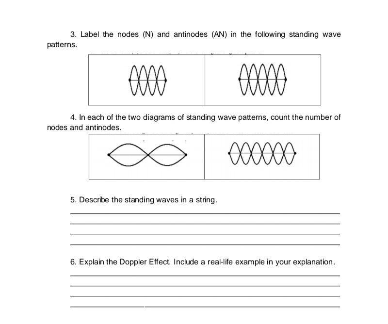 Solved 3. Label the nodes (N) and antinodes (AN) in the - Chegg Science Physics Physics questions and answers 3. Label the nodes (N) and antinodes (AN) in the following standing wave patterns. oooo wemo 4. In each of the two diagrams of standing wave patterns, count the number of nodes and antinodes. 5. Describe the standing waves in a string. 6. Explain the Doppler Effect.